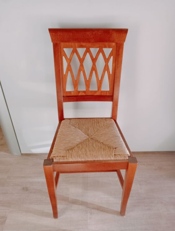 Sedia in legno tinto noce medio anticato con seduta in paglia vera. L. cm 43 x P. cm 38 x H. cm 94 H. seduta cm. 46 . Disponibili pronta consegna presso nostro showroom.